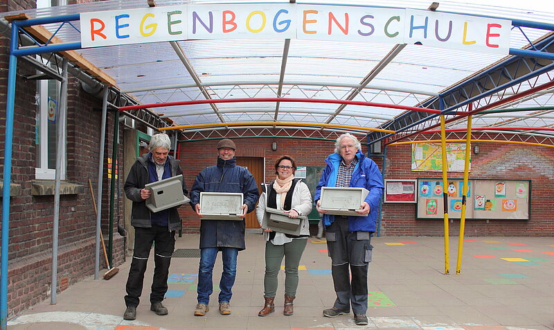 Am höchsten Gebäude der Schule brachte die NABU-Gruppe Krefeld fünf Nistkästen für Mauersegler an.