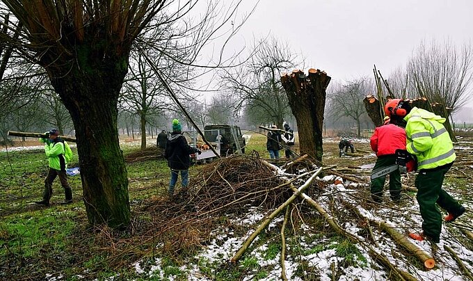 Der NABU-Pflegetrupp schneidet im Gegensatz zu kommerziell arbeitenden Unternehmen, (die lange Kopfweidenreihen immer in einer Aktion radikal herunterschneiden,) jedes Jahr nur einige Bäume aus einer Reihe. So haben die hier lebenden Vögel, Schmetterlinge und Raupen eine viel größere Überlebenschance. In diesem Jahr werden wieder fünf alte Kopfweiden geschnitten. Die dicken Ruten sind mittlerweile ca.10 Meter lang und bis zu 15 cm dick.