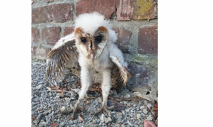Obwohl der Federaufbau noch nicht abgeschlossen ist und sie noch nicht fliegen können, springen junge Schleiereulen in die Tiefe. Eigentlich sind sie 60 Tage im Nest und werden von den Alttieren versorgt, doch die Hitze lässt ihnen keine Wahl.