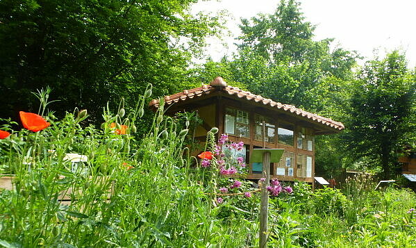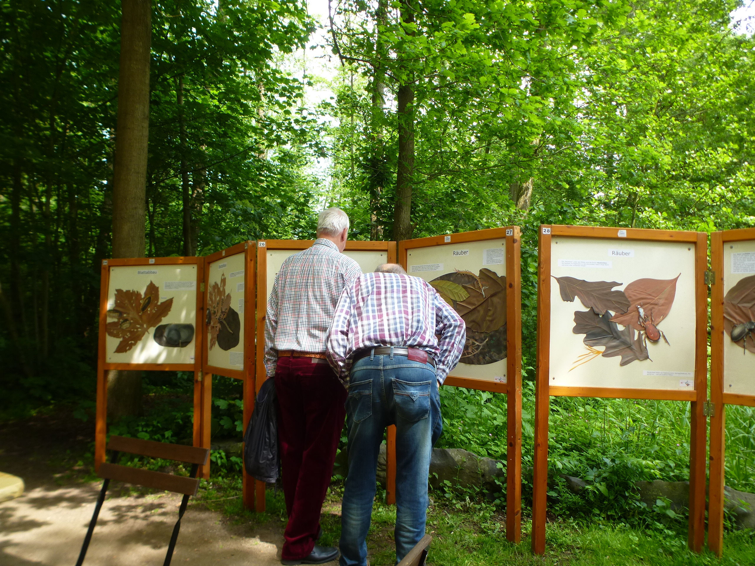 Das Wildbienenhaus mit seinen vielen Nistmöglichkeiten war ein Anziehungspunkt für die Besucher. Heike Monsieur veranstalte jede Stunde eine Führung durch den Naturerlebnisgarten. Hierbei erklärte Sie auch die drei neu angelegten Hochbete mit ihren Pflanzen, die Sie mit ihrem Sohn im Winterhalbjahr gebaut hatte. Mit Hinweisschildern, ob Wildbienen- und Insektenfreundlich wurden verschiedene Pflanzen gekennzeichnet. Weiterhin gab es eine Ausstellung  mit 20 umfassenden Tafeln über das Leben mit dem Titel " Viel los im Boden " zu sehen. Jürgen Gehlen  hielt einen Vortrag  über Insekten im naturgarten Garten in der Umweltstation.