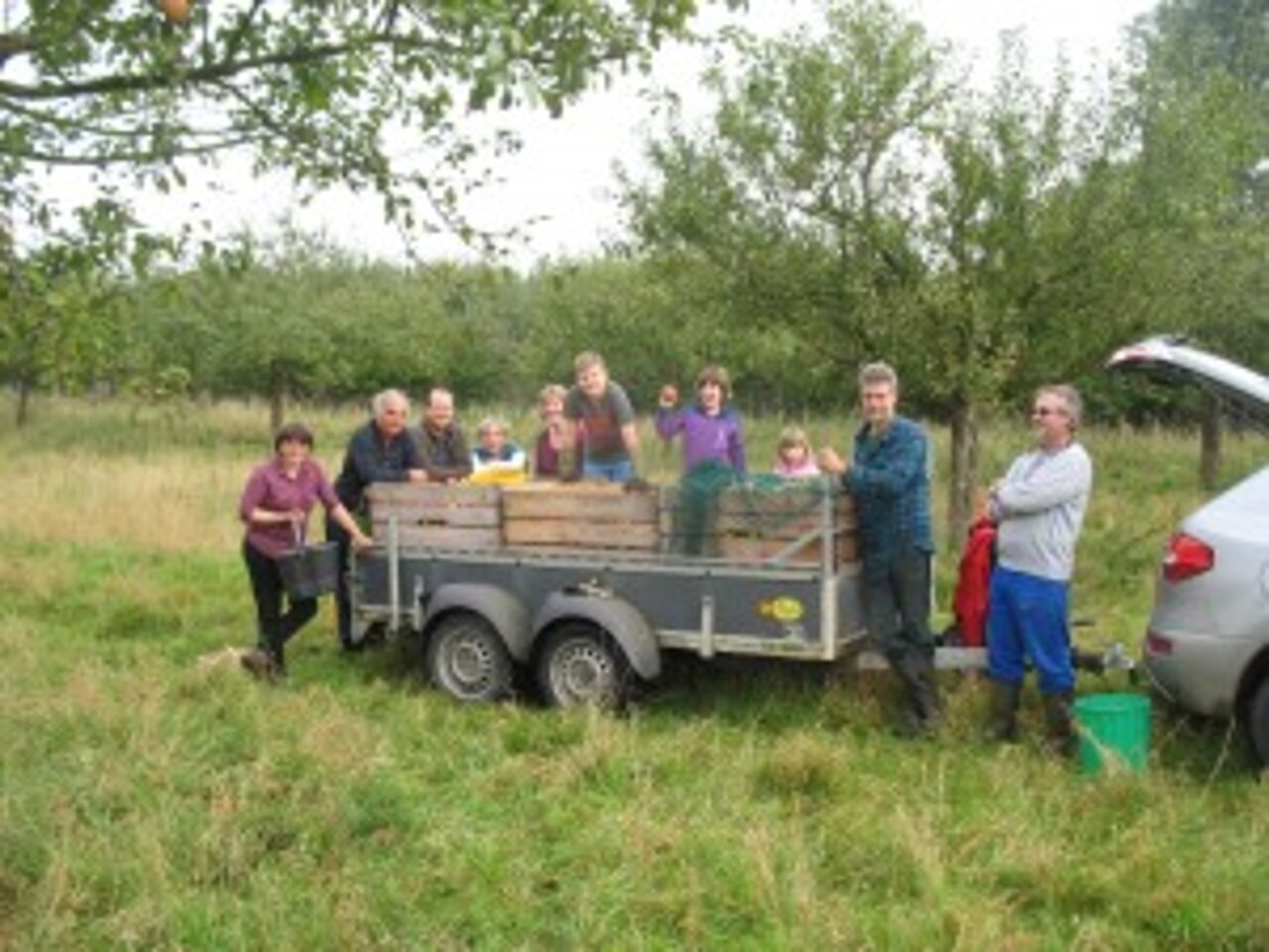 13 fleißige Helfer, darunter 4 Kinder, hatten ihren Spaß, zumal das Wetter mitspielte. In zwei Stunden rüttelten und sammelten sie fast eine Tonne Obst, das dann von Günter zur Sammelstelle bei Raiffeisen gefahren wurde und von dort zur Mosterei transportiert wird. Es gibt hier etwa 10 alte Apfelsorten, beispielsweise Boskoop, Gloster, Sternrenette, Kaiser Wilhelm, Cox und Rheinischer Krummstiel.