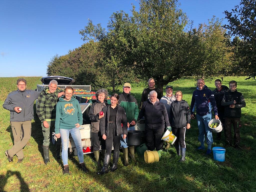 Am 14.10.2023 waren wieder 15 Helfer der Ortsgruppe auf der Streuobstwiese in Oberkrüchten fleißig. Die Apfelernte stand an und das bei schönstem Herbstwetter mit strahlend blauem Himmel. Ausgestattet mit Eimern, Körben, Säcken, Schüttelhaken und einem großen PKW-Anhänger wurden knapp über eine Tonne Äpfel abgeerntet und in die Behälter und Säcke auf dem Anhänger verfrachtet.