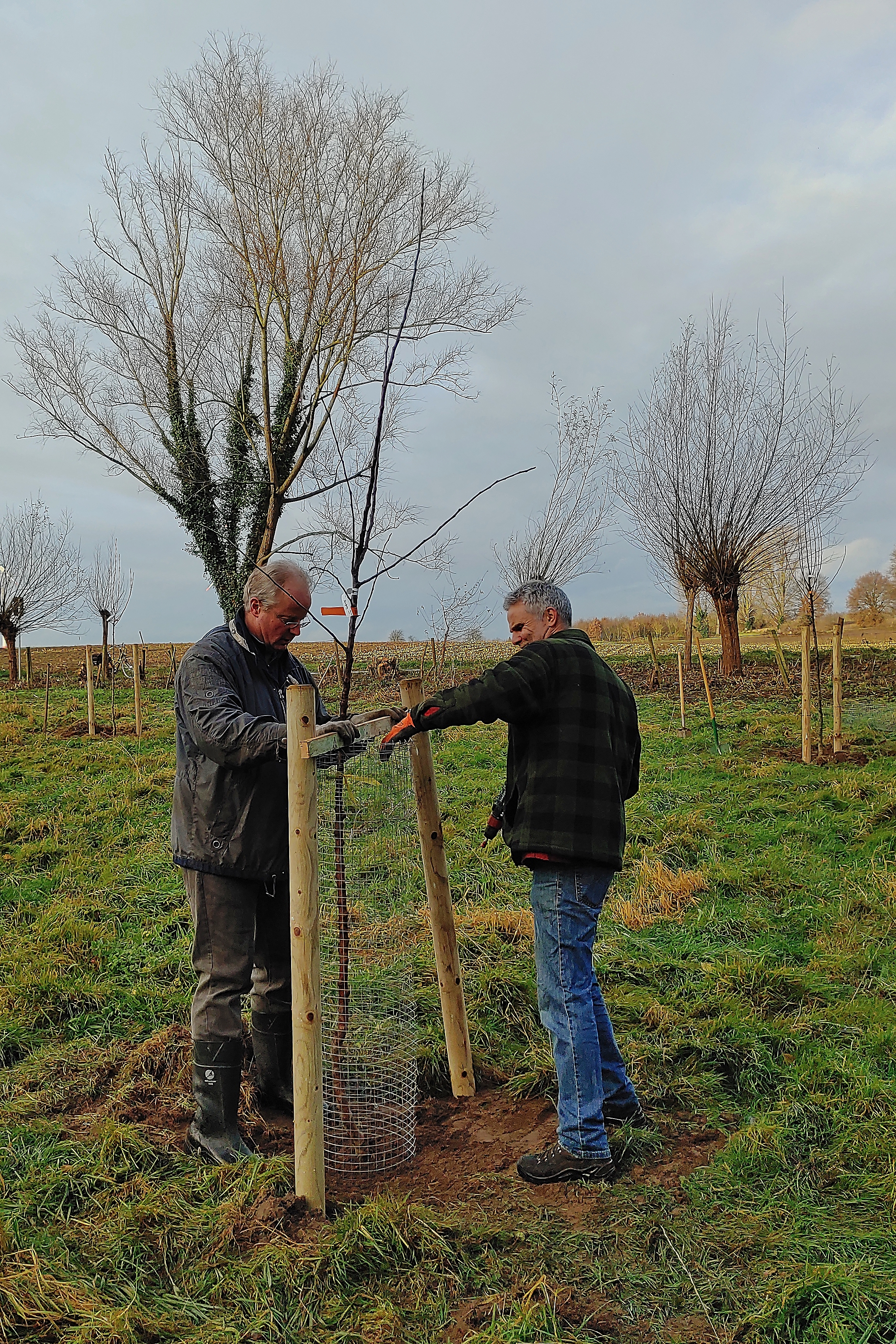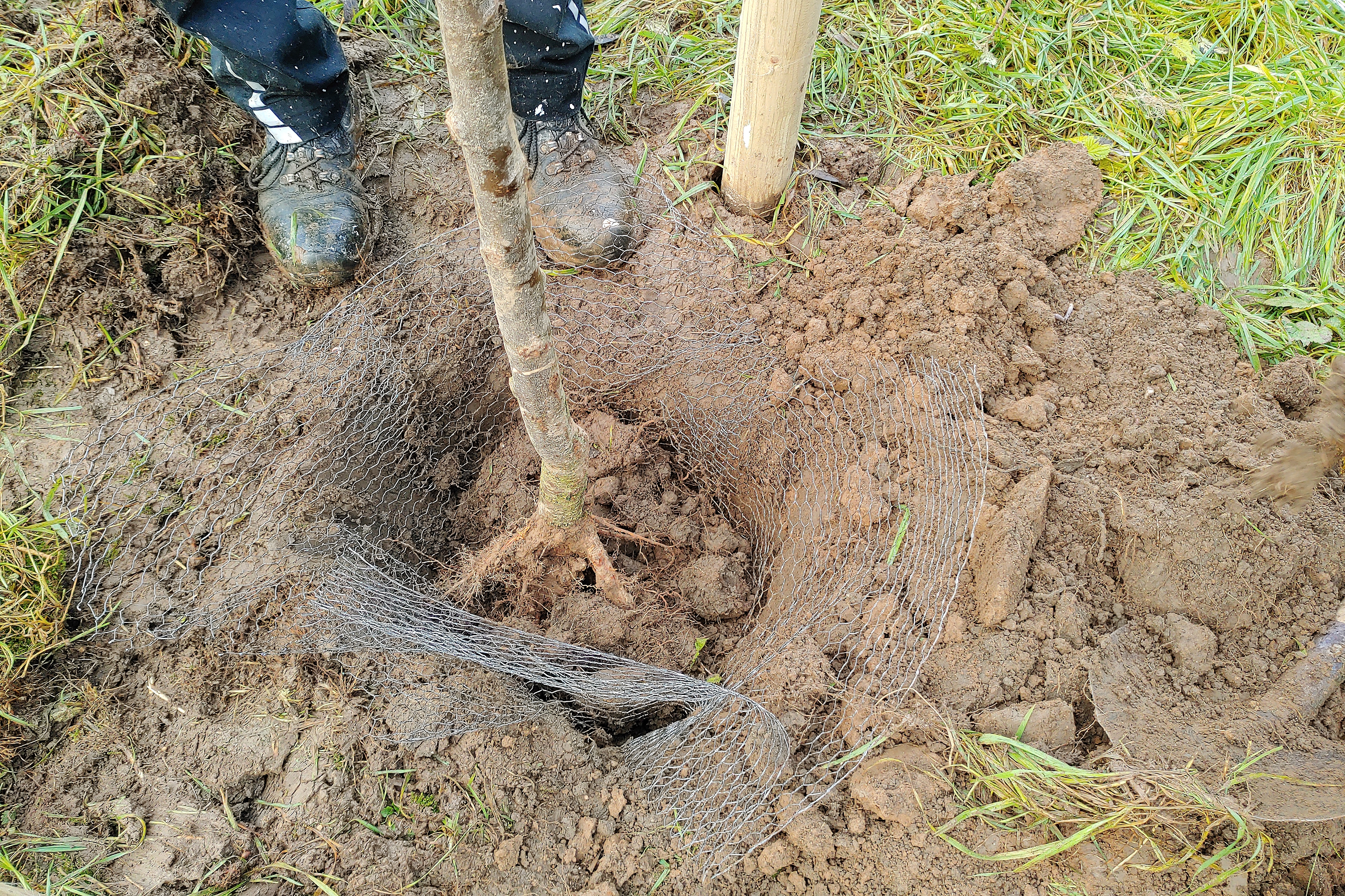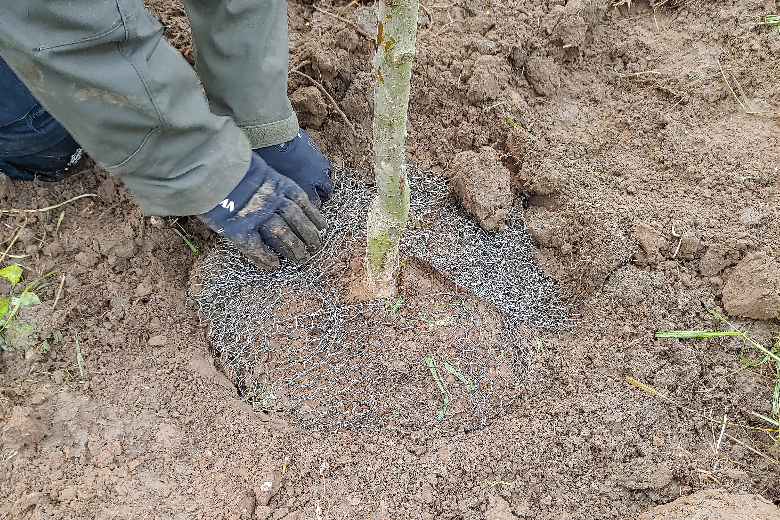 Danach wurde die Anbindung mit einem Kokosstrick erneuert und wo nötig, der Verbissschutz am Baumstamm ausgebessert oder erneuert. Der Verbissschutz ist ein Drahtgitter, das den Stamm vor Wildtieren schützt, die sich gerne an der saftigen Rinde der Jungbäume zu schaffen machen, oder sogar vor dem Biber, der sich so einen jungen Baum gerne als Snack zwischendurch gönnen würde.