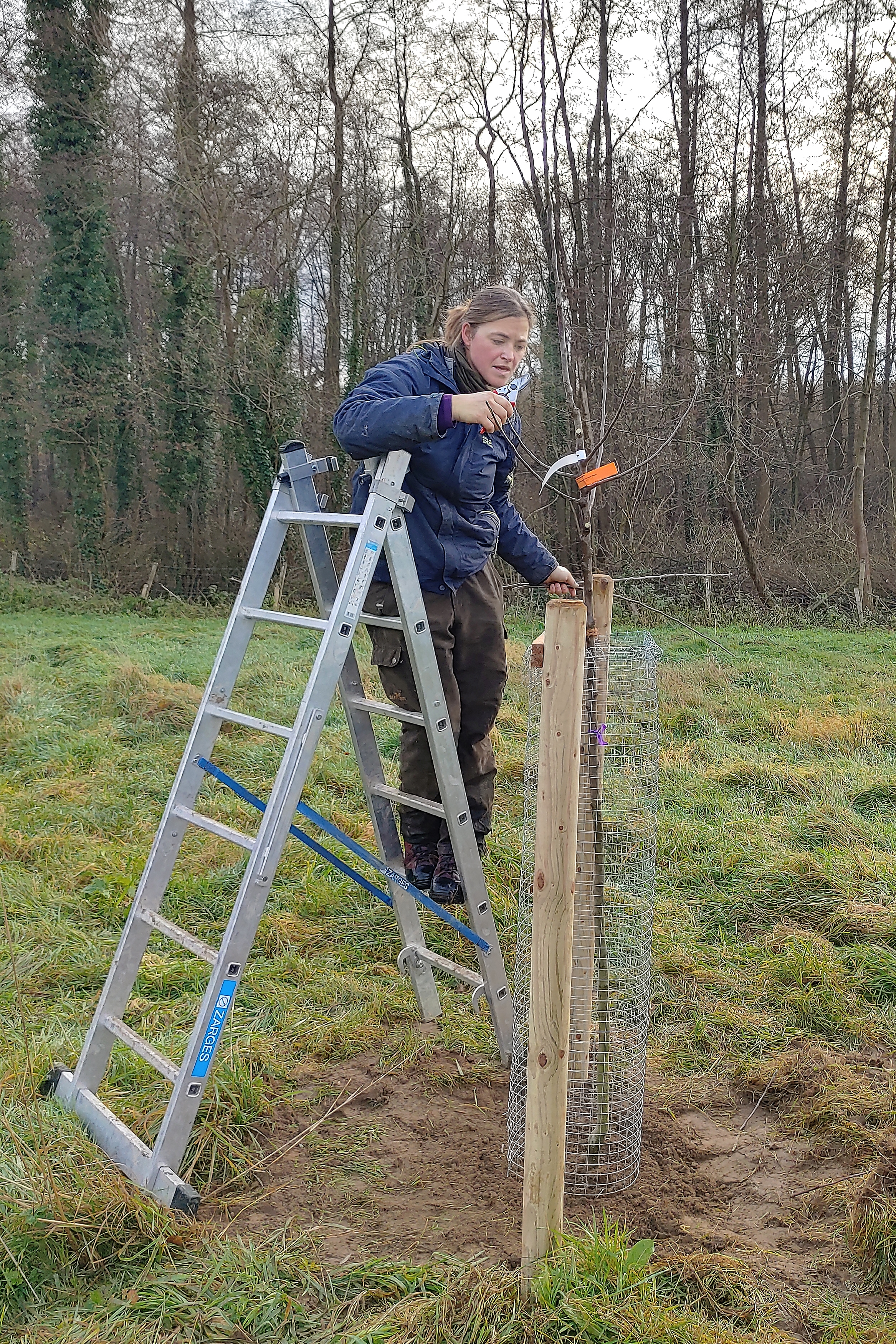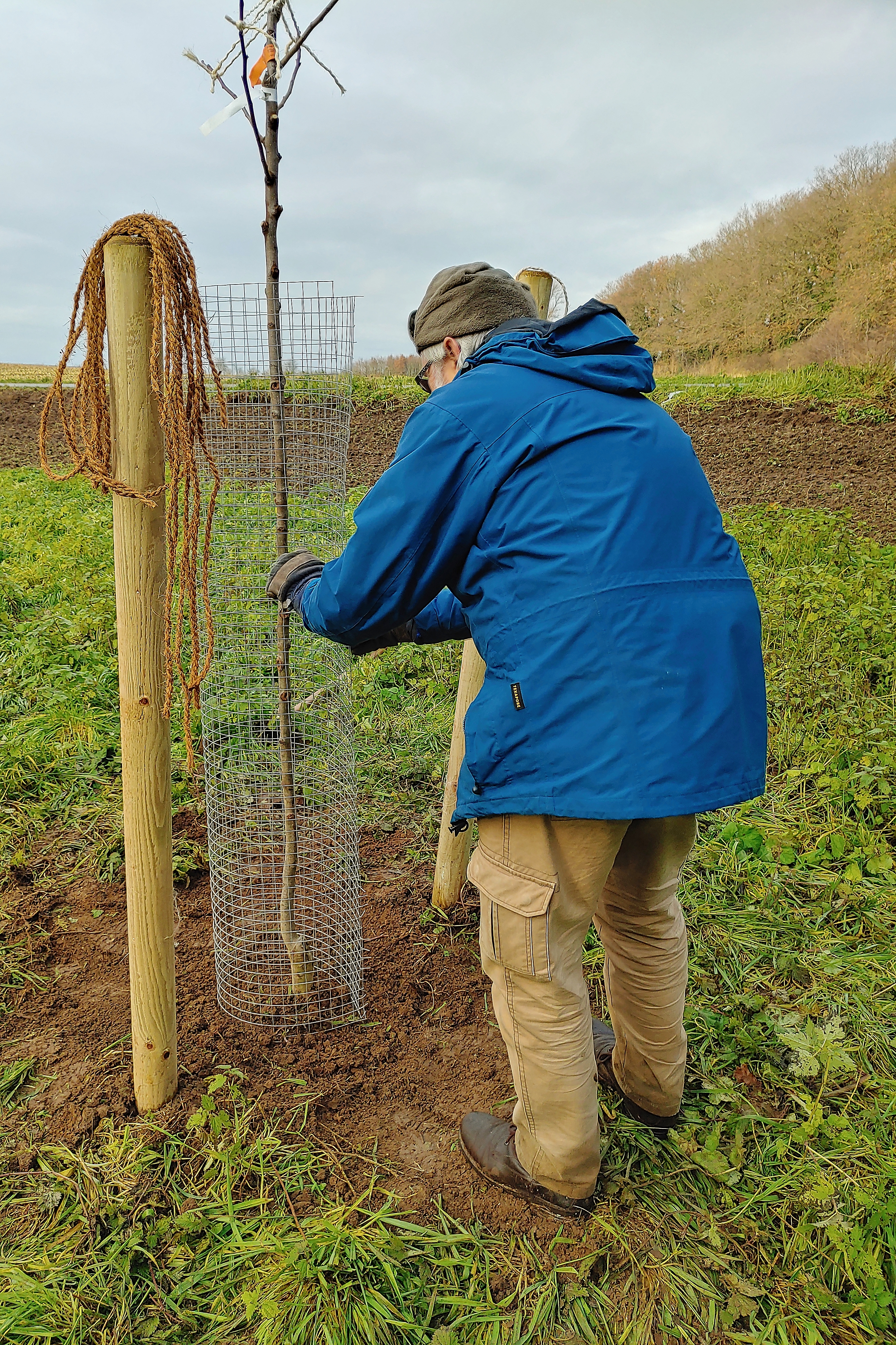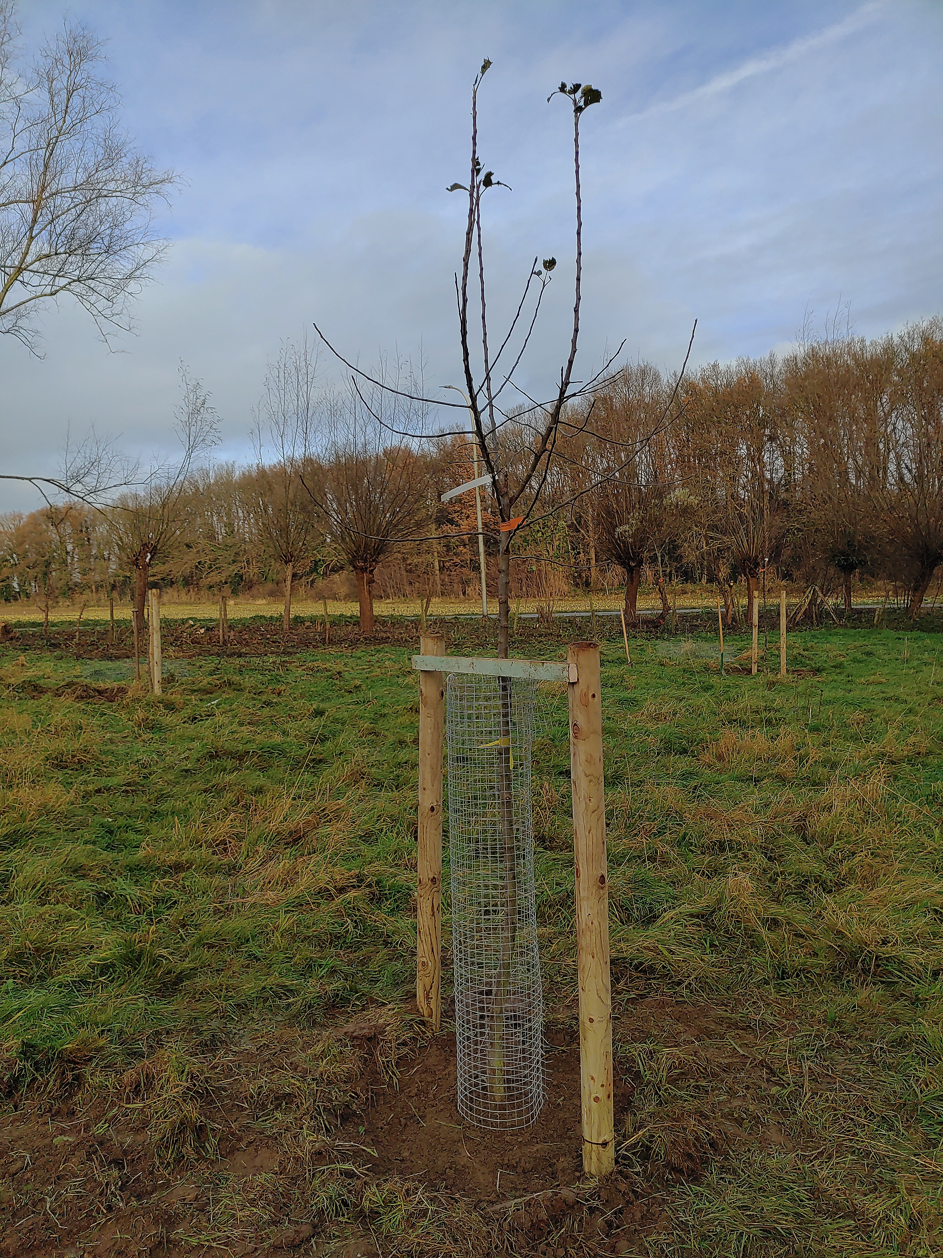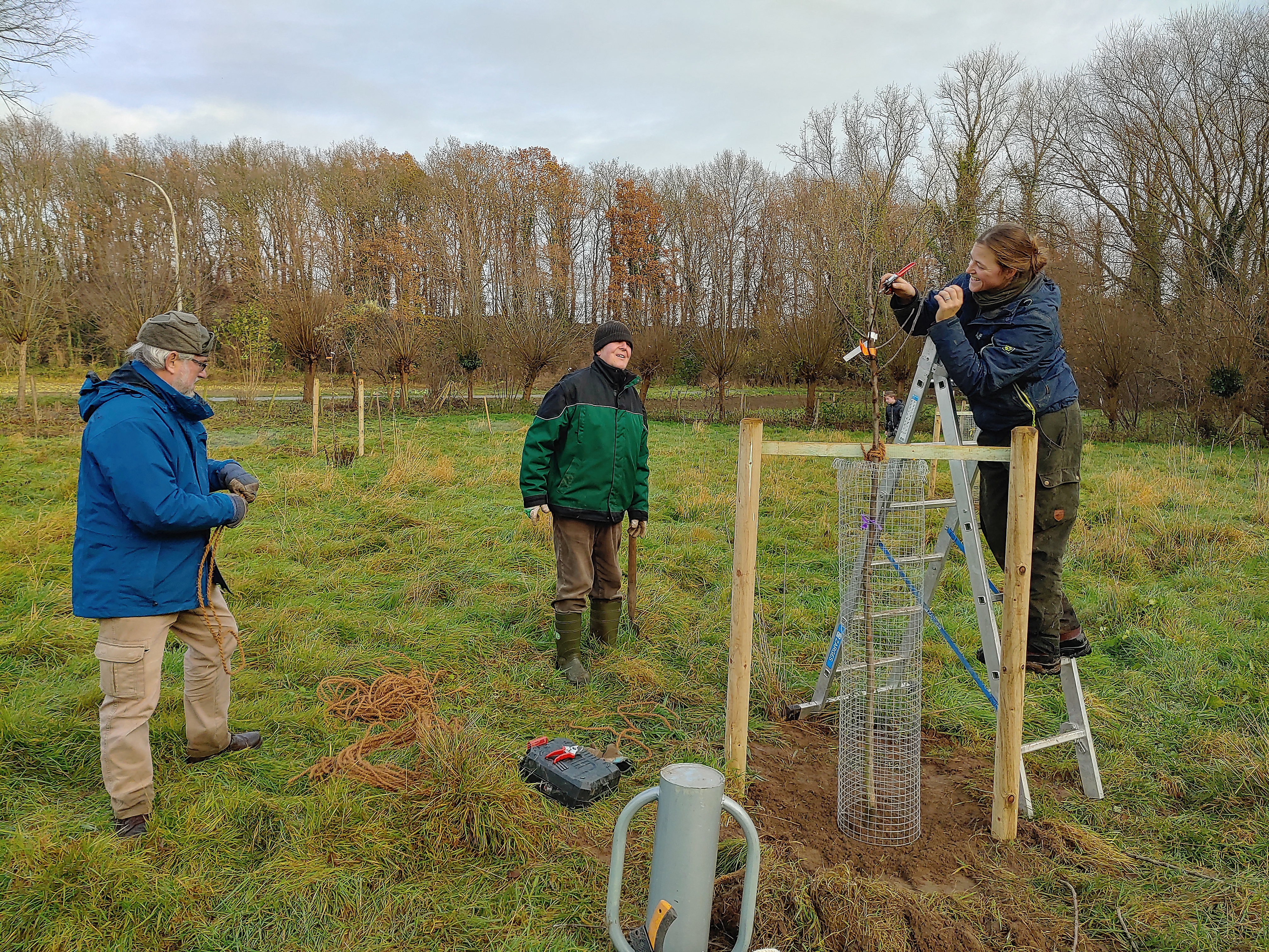 Danach wurde die Anbindung mit einem Kokosstrick erneuert und wo nötig, der Verbissschutz am Baumstamm ausgebessert oder erneuert. Der Verbissschutz ist ein Drahtgitter, das den Stamm vor Wildtieren schützt, die sich gerne an der saftigen Rinde der Jungbäume zu schaffen machen, oder sogar vor dem Biber, der sich so einen jungen Baum gerne als Snack zwischendurch gönnen würde.