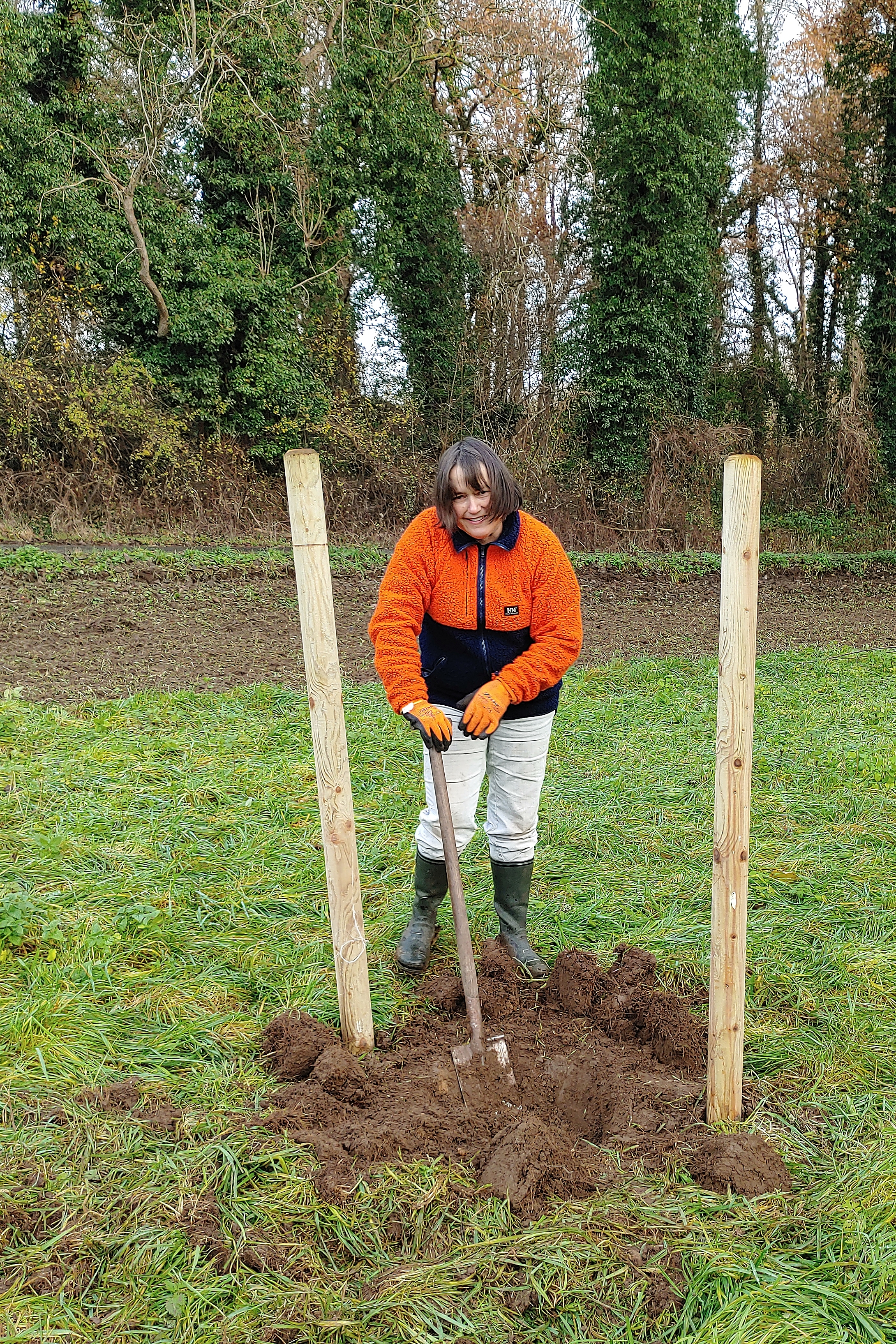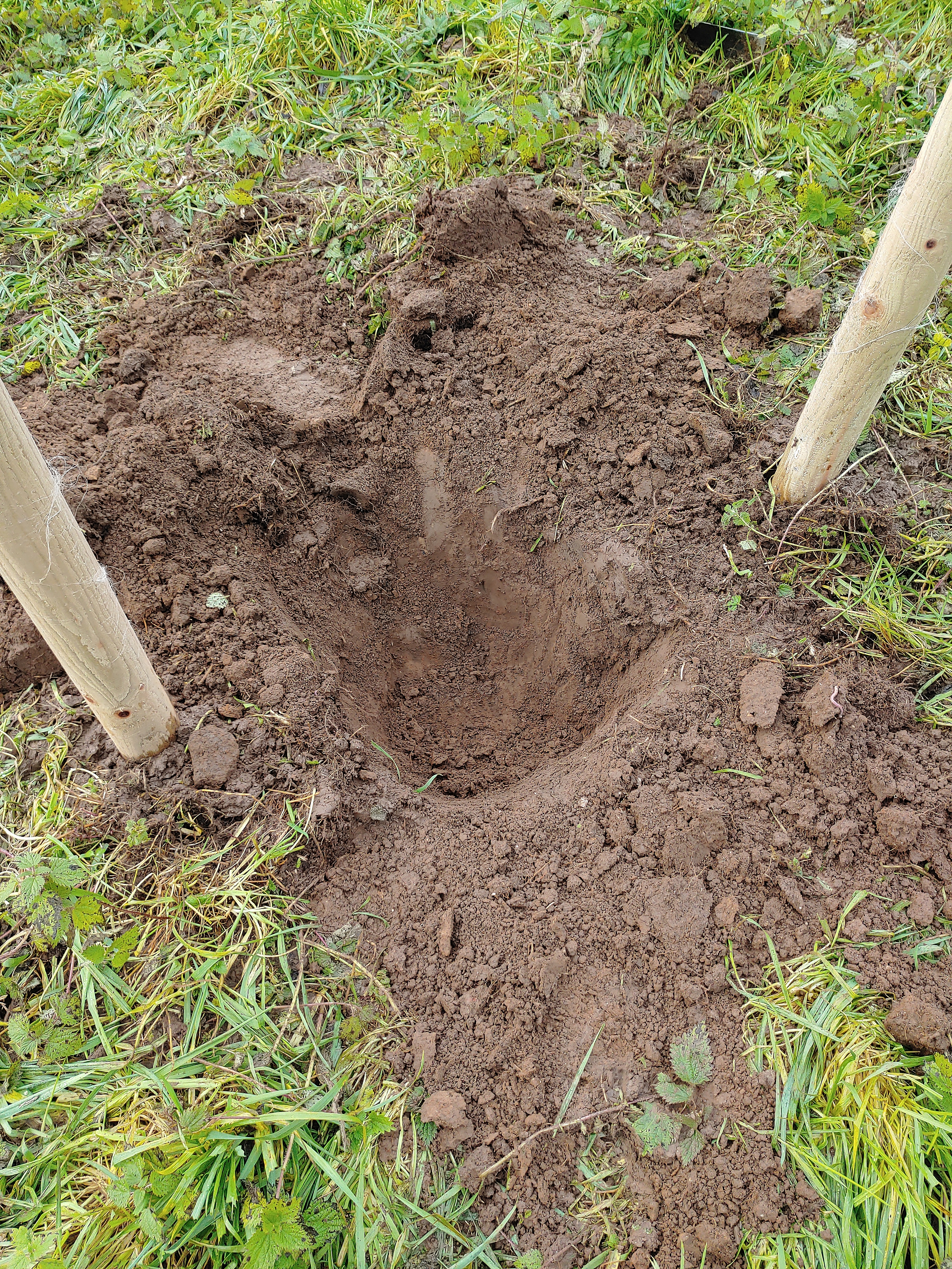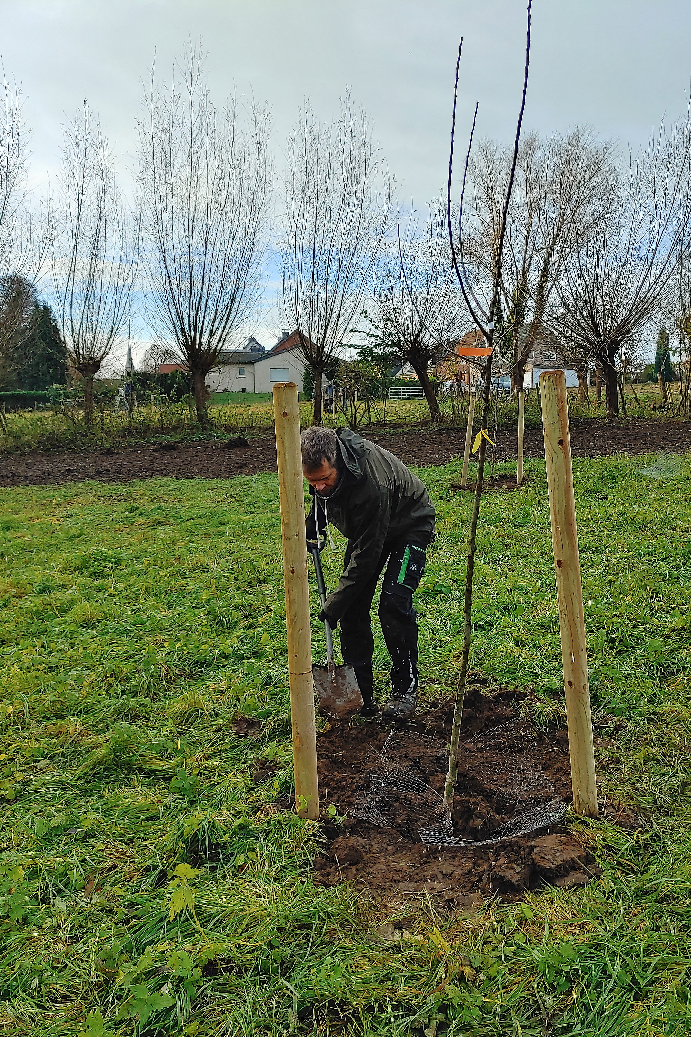 Die Standorte der Bäume waren bereits markiert, jetzt mussten die Pflanzlöcher ausgehoben werden, der Wühlmauskorb eingebracht werden, die Wurzeln der Bäume beschnitten werden, die Bäume gepflanzt werden, der Wühlmauskorb oberhalb des Wurzelballens verschlossen werden, das Pflanzloch zugeschüttet werden, der Hochstamm angebunden werden, der erste Erziehungsschnitt erfolgen und die neue Baumscheibe hergerichtet werden.