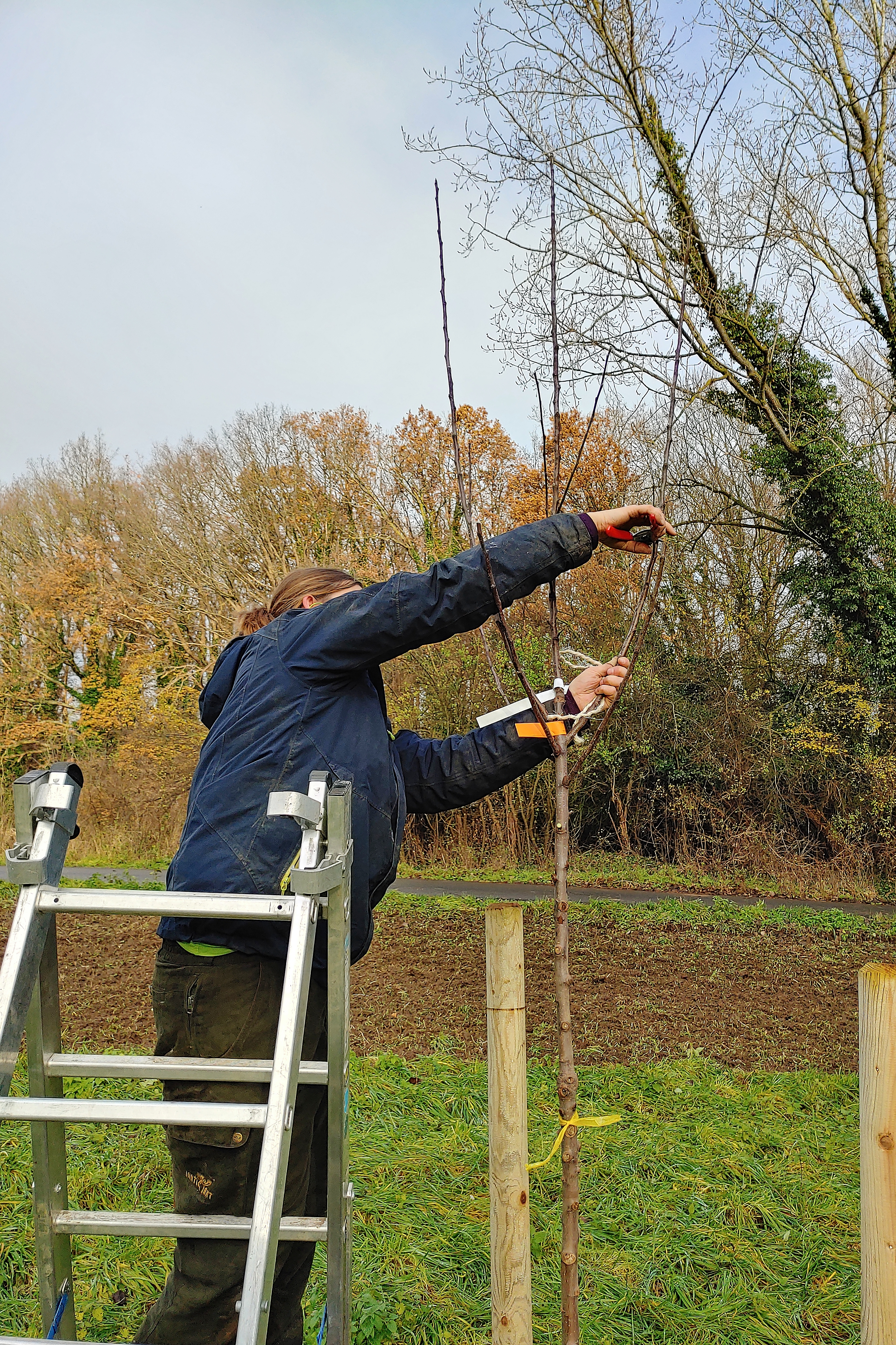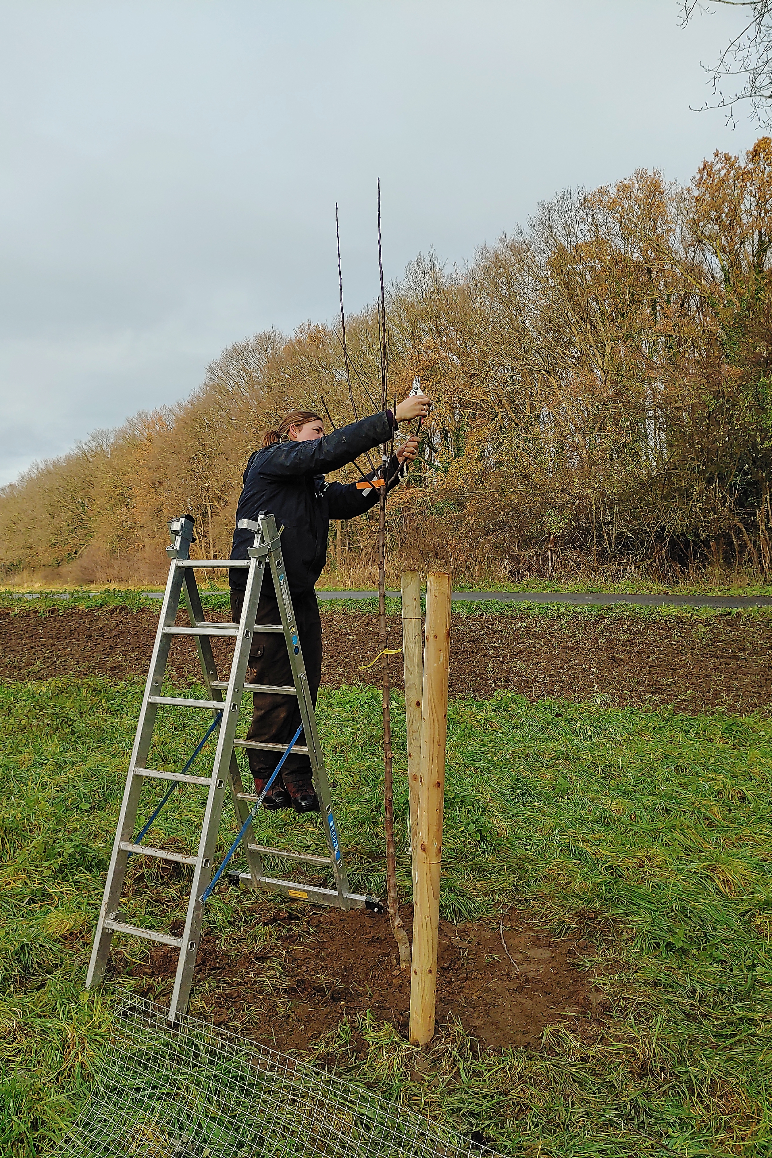 Für den fachmännischen Pflegeschnitt der Bäume, konnten wir Ralf gewinnen. Mit geschultem Auge wurde die Wuchsstruktur eines jeden Baumes begutachtet. Ziel war es, der zukünftigen Krone des Baumes eine pyramidale Form zu geben. Für die pyramidenförmige Krone wurde zuerst der Mitteltrieb ausgemacht und ggf. konkurrierende Triebe entfernt.