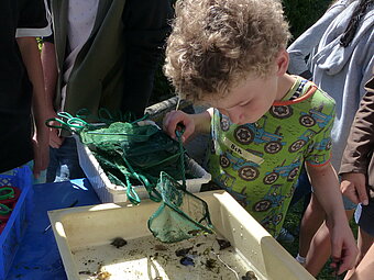 In zwei Workshops erfuhren die Kinder vieles über das lebensnotwendige Nass. Bei der Teichuntersuchung durfte selbst geforscht werden: Ausgestattet mit Becherlupe, Keschern und Bestimmungsschlüsseln lernten die Kinder die großen und vor allem auch die kleinen Lebewesen im Wasser kennen und hatten so die Artenvielfalt des Lebensraums direkt vor Augen. Gleichzeitig wurde hier spielerisch deutlich, dass kein Lebewesen für sich allein existiert: Alle sind in einem Ökosystem abhängig von anderen.