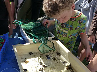 Wir erforschen gemeinsam das spannende Leben im Gewässer. Mit Keschern und Becherlupen gehen wir auf Entdeckungstour und lernen viele verschiedene Bewohner des Teiches kennen. Wir schauen uns genau an, was alles über, auf und im Wasser lebt. Die Vielfalt der Lebensformen wird begeistert wahrgenommen und dokumentiert. Durch die bewusste Wahrnehmung des vielfältigen Lebens im Wasser wird die lokale und globale Bedeutung dieses Lebensraums für die Kinder erlebbar.