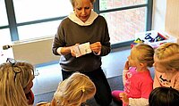 Nabu-Naturtrainerin Elita Grafke zeigt den Kindern das Daumenkino, das auf die Gefahr für Tiere.....