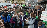 Schüler verlasen bei der Demonstration auf dem Kempener Buttermarkt Botschaften – unter anderem einen offenen Brief an Bundeskanzlerin Angela Merkel. Foto: Wolfgang Kaiser