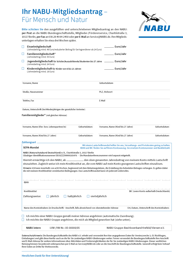 Sie möchten ihren Mitgliedsantrag nicht online ausfüllen? Das Formblatt "NABU Mitgliedsantrag" können sie hier als PDF downloaden.